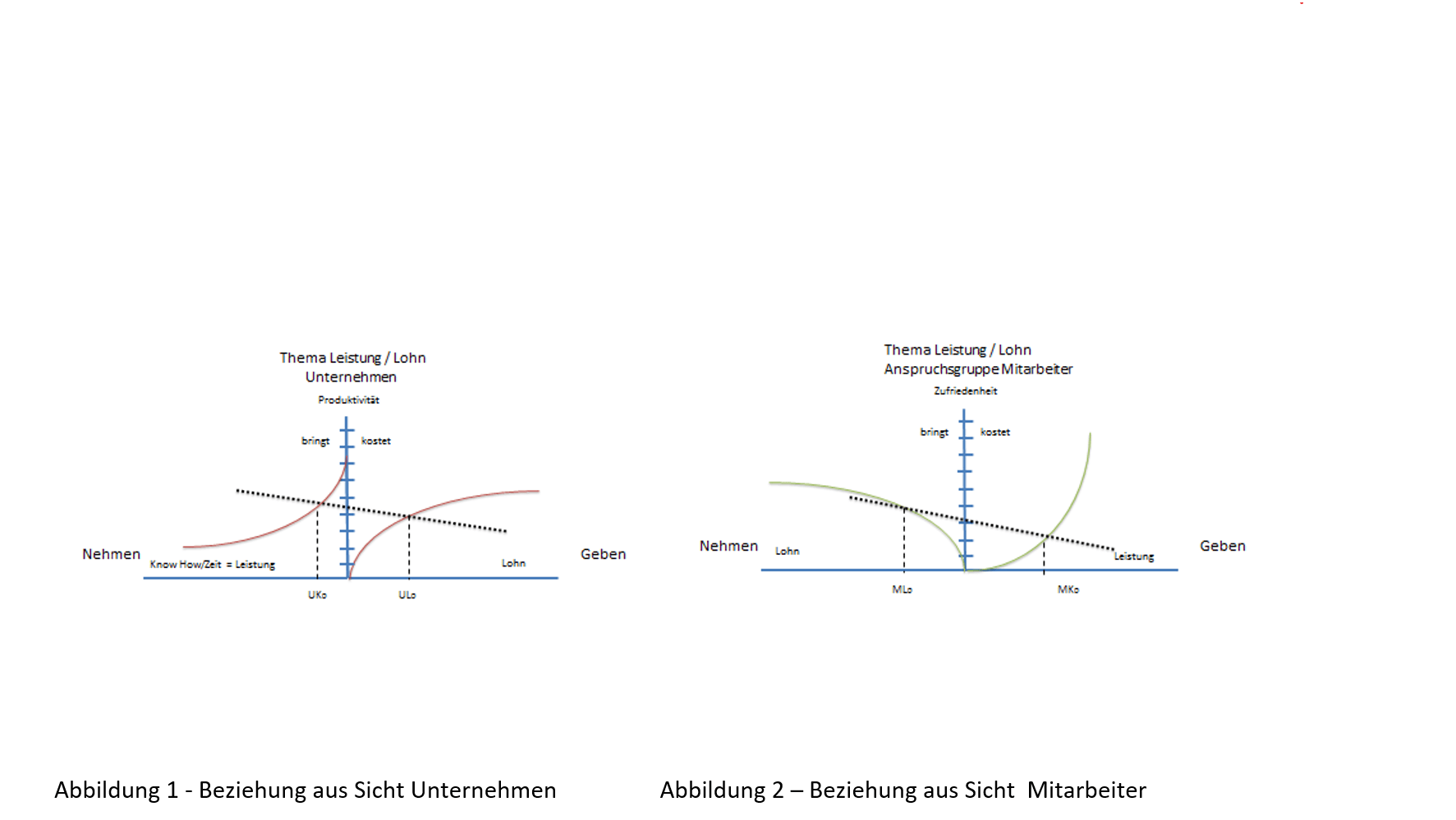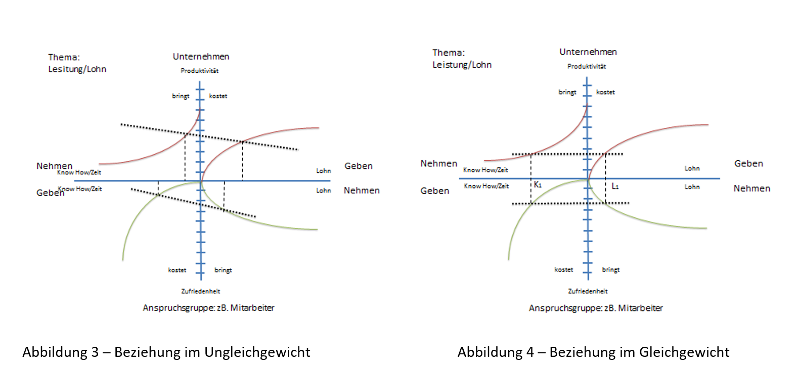 Ein Unternehmen nimmt Leistung vom Mitarbeiter in Form von Knowhow/Zeit und misst die Qualität der Beziehung in der gewonnen Produktivität. Die so entstandene Produktivitätsfunktion (linker oberer Quadrant) zeigt zum Beispiel nach Cobb Douglas abnehmende Grenzwerte. Im Gegenzug gibt das Unternehmen Lohnzahlungen. Jeder zusätzliche Euro wird in vielen Fällen dabei weniger Produktivität bringen (rechter oberer Quadrant). Auf der anderen Seite bewertet der Mitarbeiter dieselbe Beziehung mit dem Niveau der eigenen Zufriedenheit. Jede zusätzliche Leistung, die er dem Unternehmen gibt kostet mehr und mehr Zufriedenheit (linker unterer Quadrant). Der dafür erhaltene zusätzliche Lohn bringt jedoch abnehmende Zufriedenheit (rechter unterer Quadrant). Da jeder Akteur versuchen wird mehr zu nehmen als zu geben, entstehen Ungleichgewichte (gestrichelte Linien).